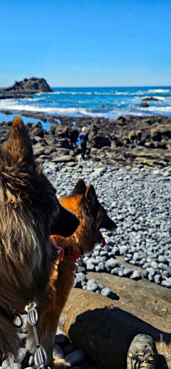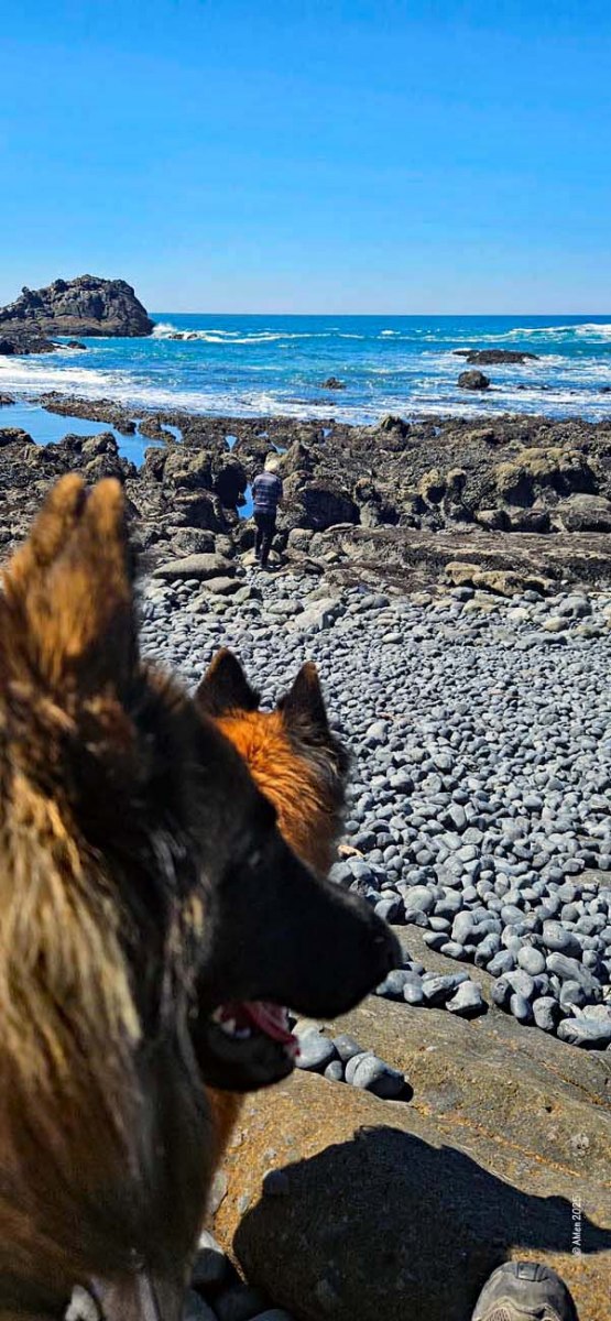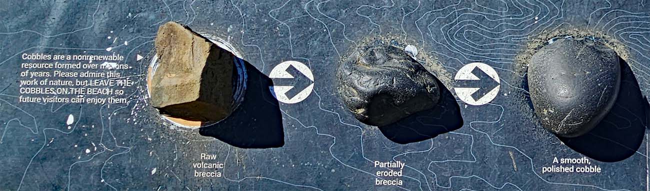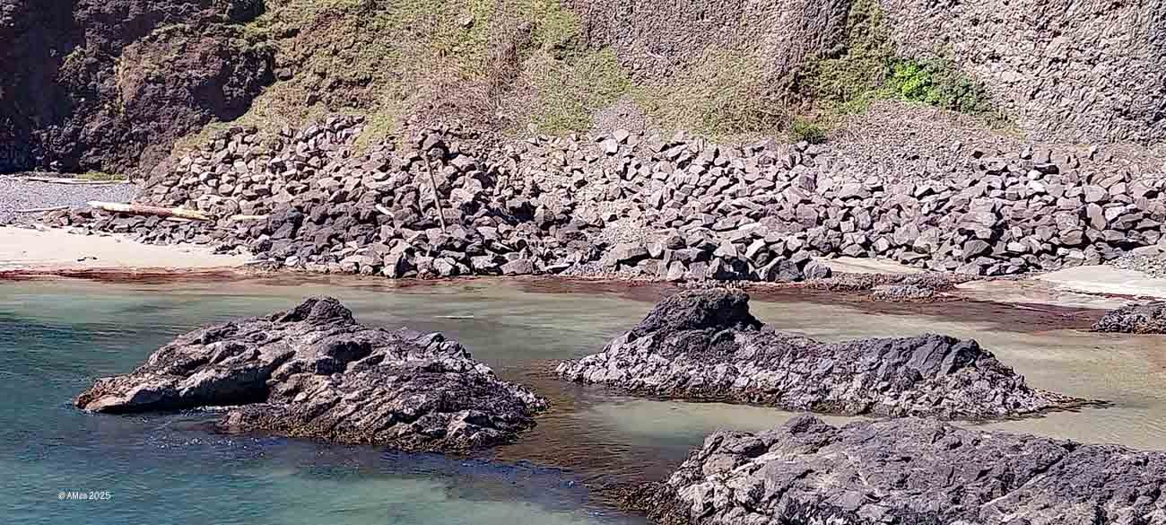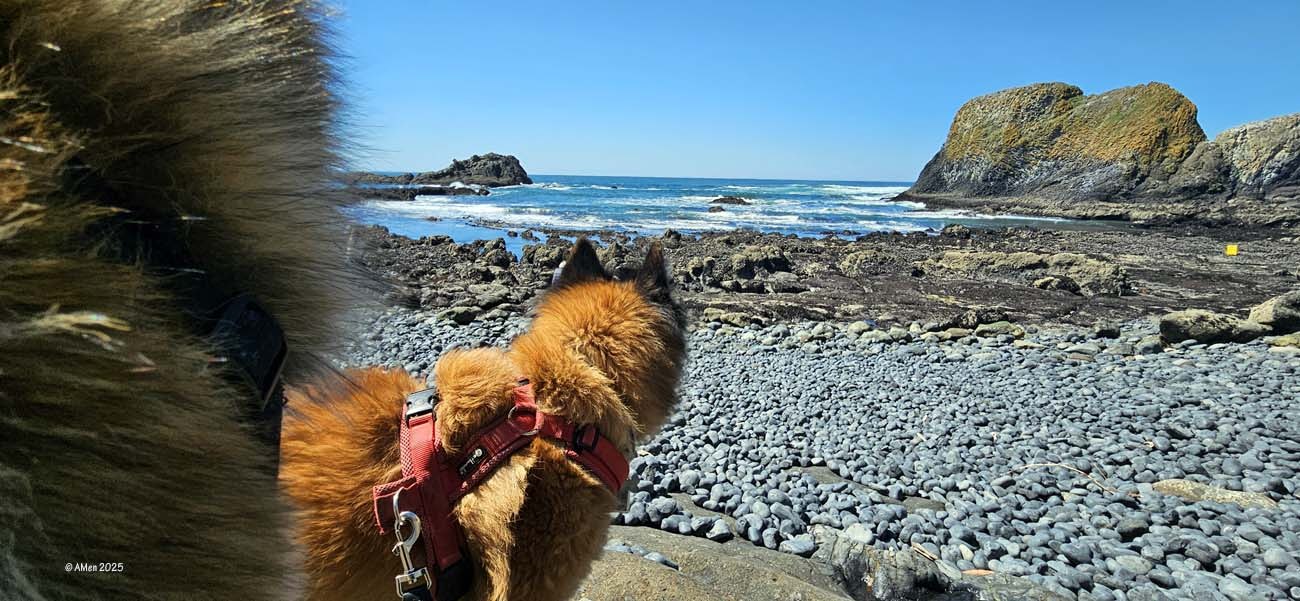 Holztreppen führen zu den Gezeitentümpeln hinunter, Hunde dürfen mit, Wegen der Basaltkiesel die vor ca. 14 Mio Jahren durch Lava und über Jahrtausende durch Wellen und Gezeiten glatt poliert wurden ist es sehr unangenehm am Strand zu laufen.