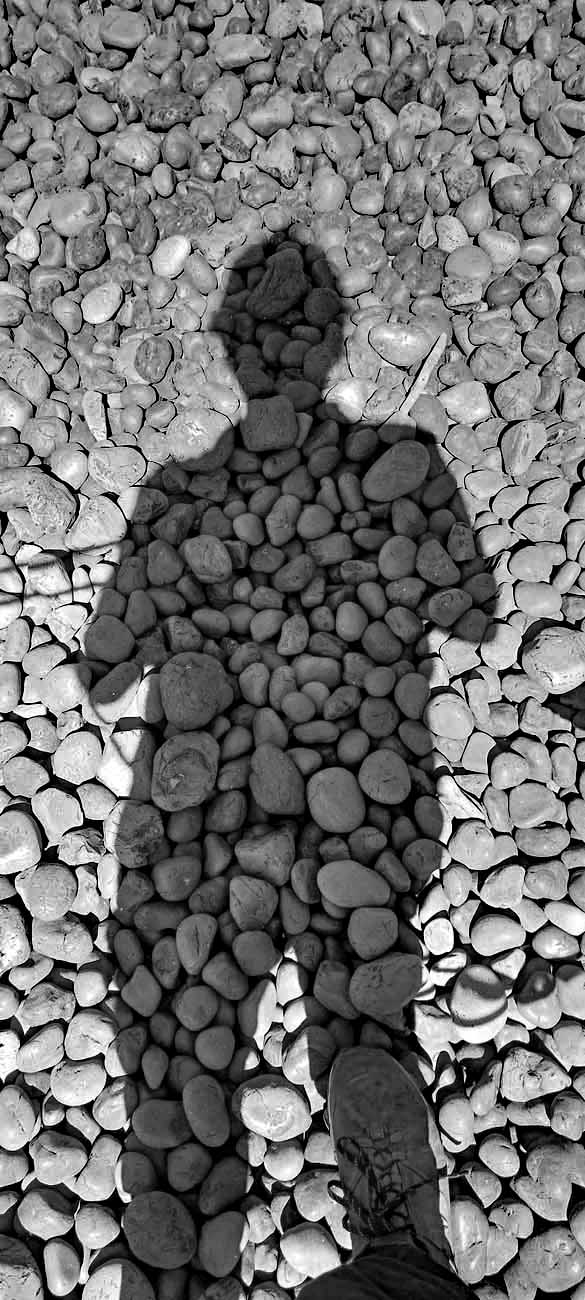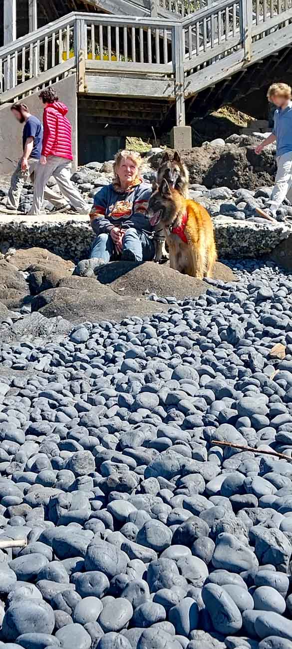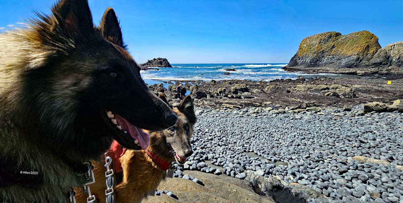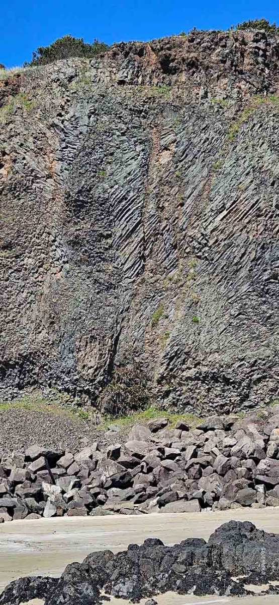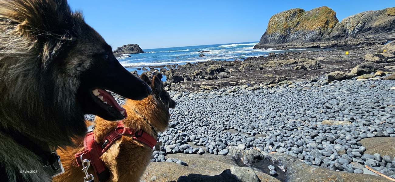 Holztreppen führen zu den Gezeitentümpeln hinunter, Hunde dürfen mit, Wegen der Basaltkiesel die vor ca. 14 Mio Jahren durch Lava und über Jahrtausende durch Wellen und Gezeiten glatt poliert wurden ist es sehr unangenehm am Strand zu laufen.