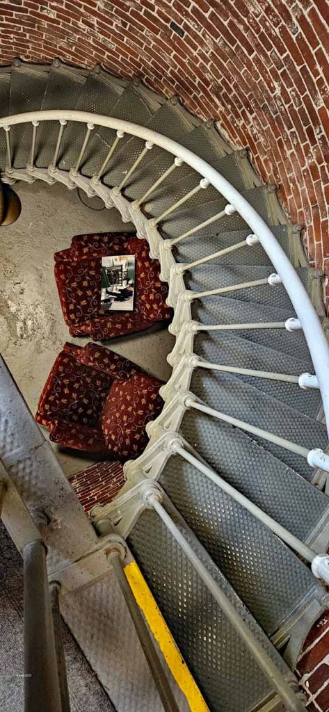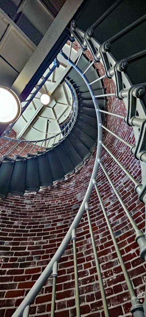 Beim Hochsteigen fiel auf, dass die gusseiserne Treppe nicht am Turm aus Backstein festgemacht war, sondern selbsttragend auf dem Fundament steht. Das sollte Stabilität und Haltbarkeit erhöhen, offenbar mit Erfolg, wie der heutige gute Zustand belegt.