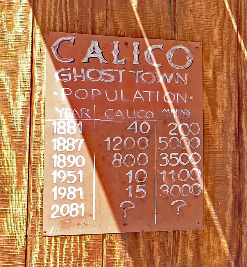 Zu ihren besten Zeiten lebten ungefähr 1.200 Menschen in Calico und es gab über 500 Minen. Heute sind es noch 8 Einwohner.