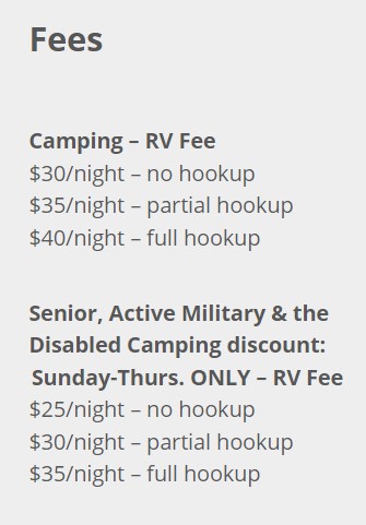 Der Eintritt (8$/Person) wird mit den Campinggebühren verrechnet, so dass wir dort für 14$ übernachteten (Senior, Partial Hookup)