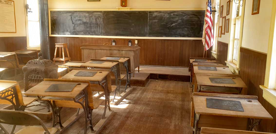 Das Originalschulhaus wurde 1885 erbaut, 1950 versuchte man das Gebäude nach Vorlage alter Bilder so originalgetreu nachzubauen, allerdings ein Drittel kleiner als das ursprüngliche Gebäude.