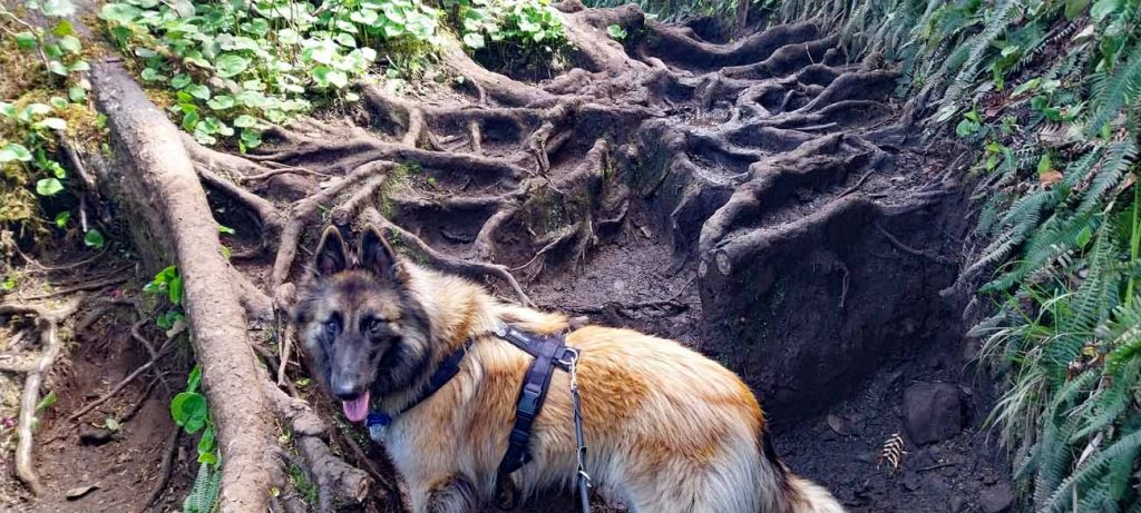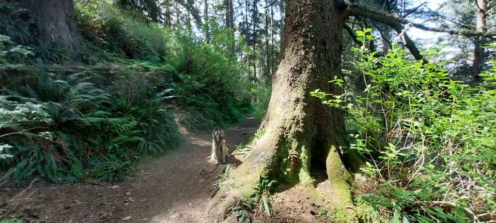 Der Gatte lief mit Hunden den South Trail am Cape Lookout, der vom Trailhead durch dichten Küstenwald hinunter zur abgelegenen South Beach führtx