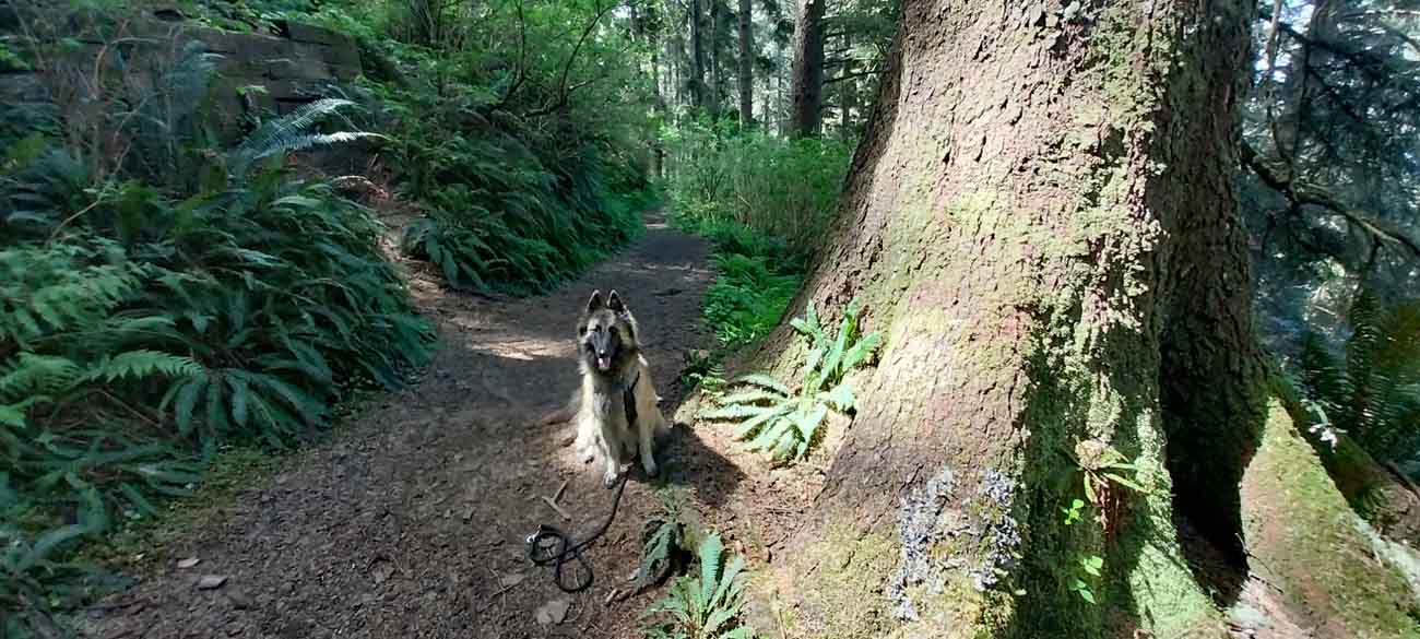 Der Gatte lief mit Hunden den South Trail am Cape Lookout, der vom Trailhead durch dichten Küstenwald hinunter zur abgelegenen South Beach führtx