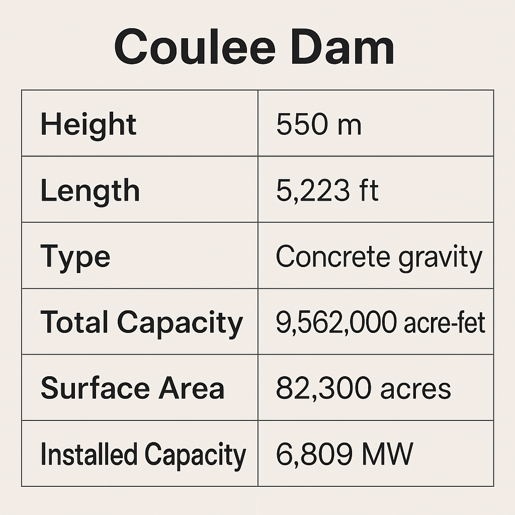 Der Grand Coulee Dam ist ein massiver Betondamm vom Typ Schwerkraftmauer. Er erstreckt sich über eine Länge von rund 1.592 Metern und erreicht eine Höhe von 168 Metern. Mit einem Betonvolumen von knapp 12 Millionen Kubikmetern zählt er zu den größten Betonbauwerken der Welt.
