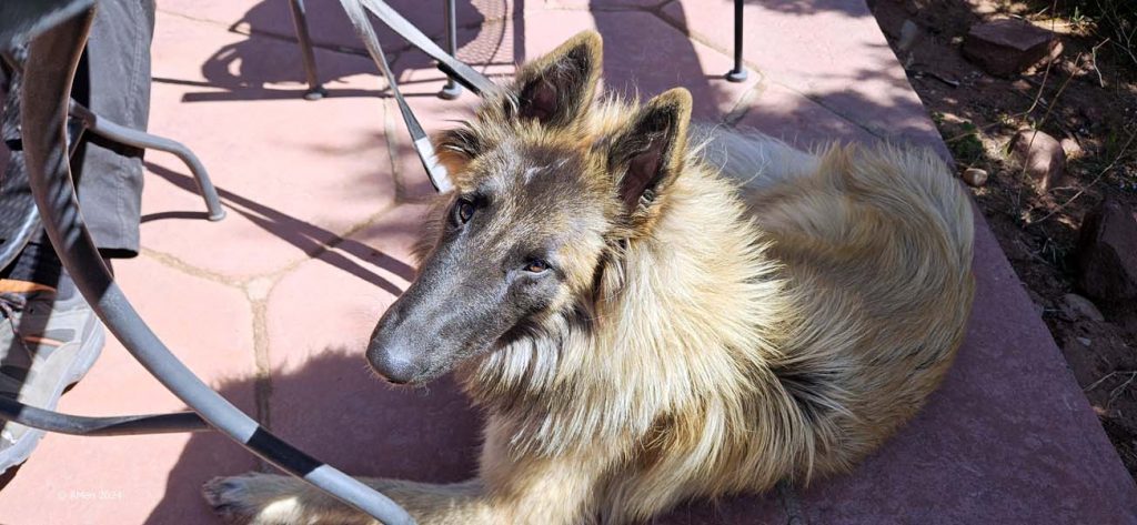 Wir saßen mit unseren Hunden sehr schön draußen, aber auch innen sitzt man toll, mit einem fantastischen Blick auf die Berge.