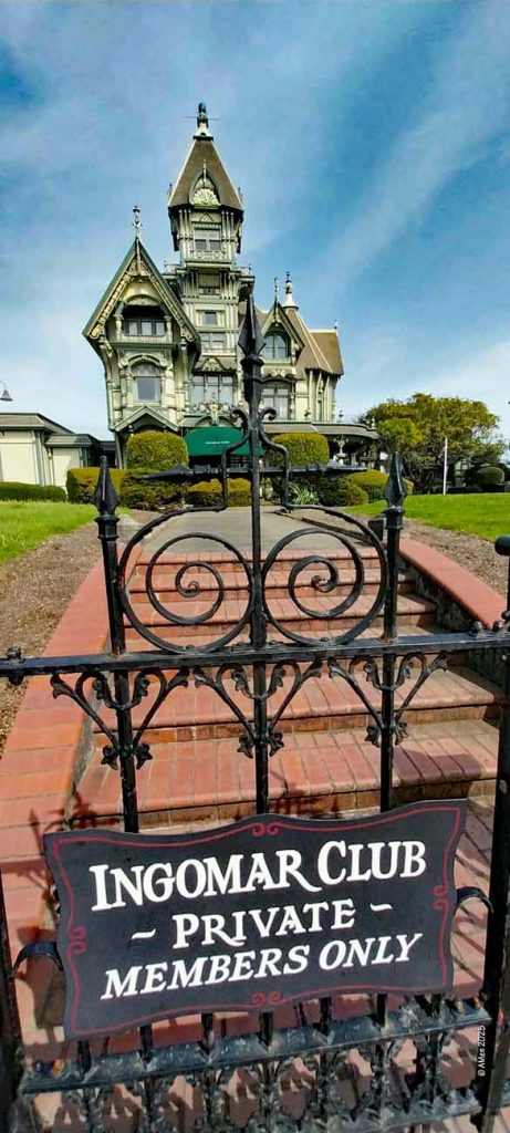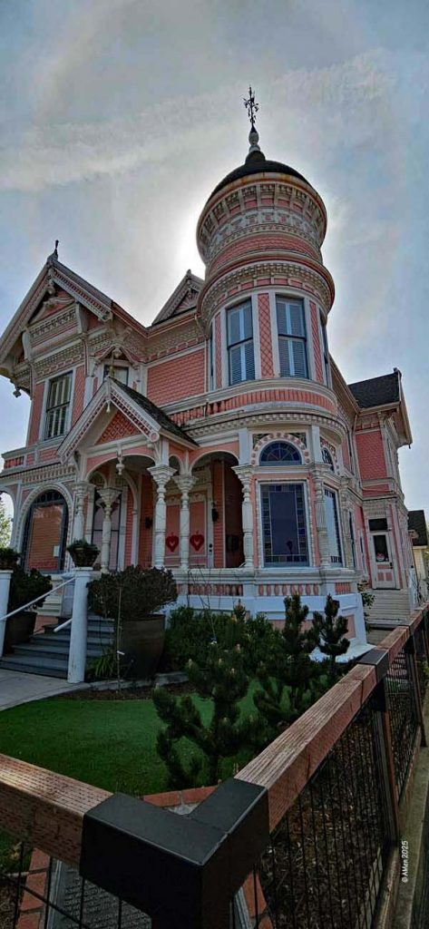 Bei dem dreigeschossige Bauwerk aus überwiegend Redwood-Holz fällt vor allem der reich verzierte Turm, die asymmetrische Fassade, die geschnitzten Holzornamente und farbigen Glasfenster auf.