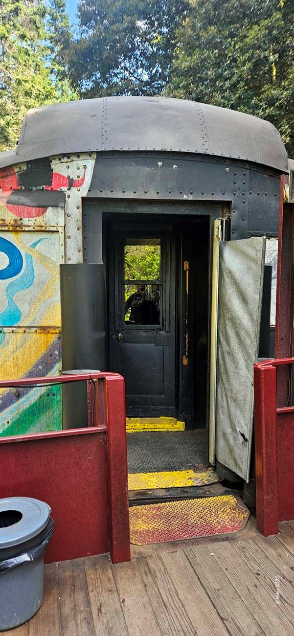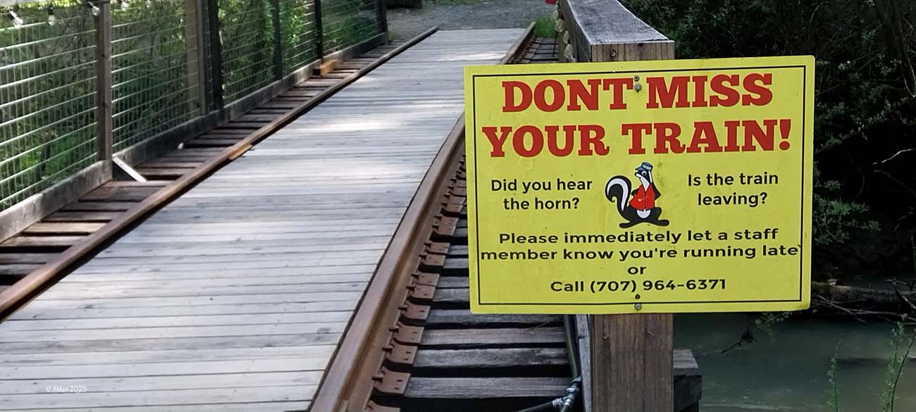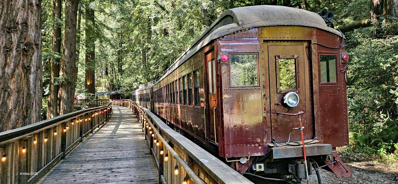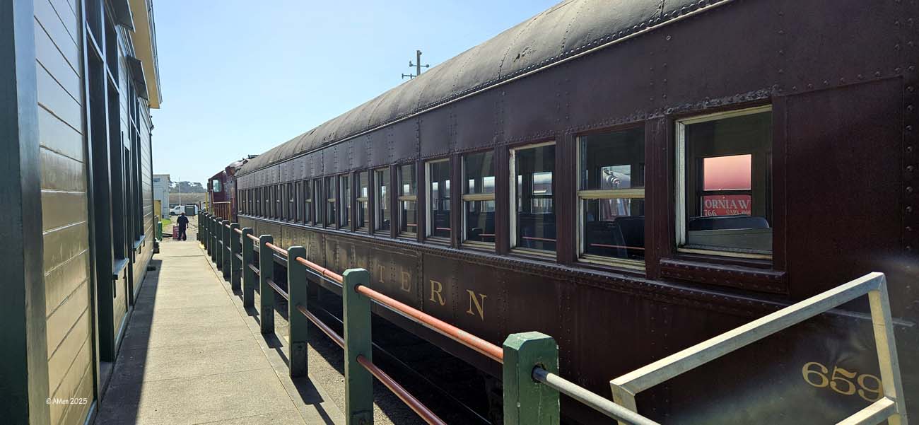 Sehr empfohlen wird eine Tour mit dem Skunk Train, der von Fort Bragg aus startet. Allerdings nahmen wir nur den kurzen „Pudding Creek Express“, eine schöne Fahrt von etwa 7 Meilen hin und zurück entlang des Pudding Creek Estuary. Insgesamt 90 Minuten dauerte die Tour, eine knappe halbe Stunde hin durch uralte Redwood Wälder, eine halbe Stunde Aufenthalt an der „Endstation“ Glen Blair Junction, mit Möglichkeit zum Spazierganz und wieder zurück.