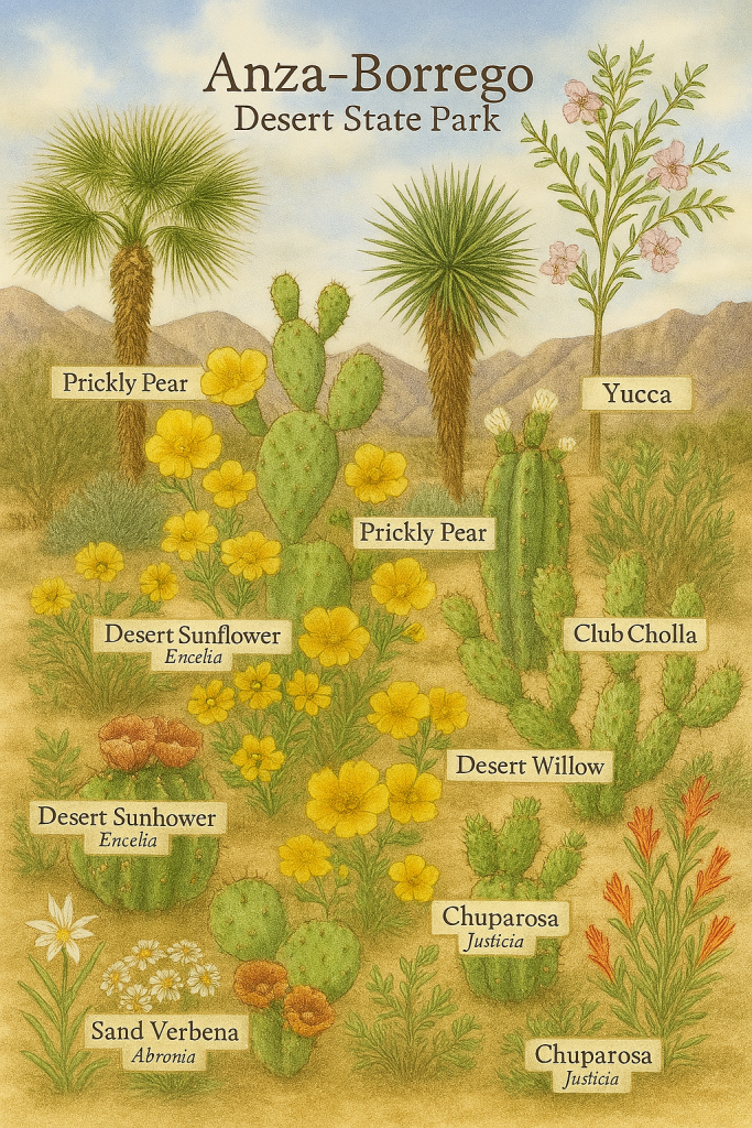 Anza war der Spanier, der mit 200 Soldaten und deren Familien von Mexiko aus an der Westküste der späteren USA empormarschierte und unter anderem San Francisco gründete. Borrego (Spanisch) leitet sich vom Bighorn Sheep her, dem Wappentier des State Parks. Anza-Borrego ist der größte State Park Californiens, nur der National Park Joshua Tree ist noch größer; er reicht vom Meeresniveau bis auf 6750 feet hinauf, und beherbergt entsprechend diverse Tier- und Pflanzenarten.