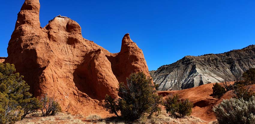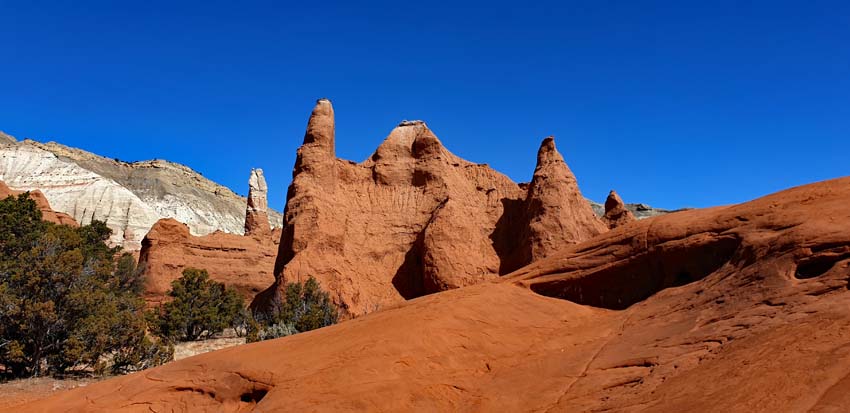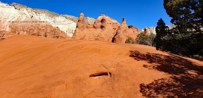 Der Kodachrome Basin Statepark erhielt seinen Namen 1948 von einer Expedition der National Geografic Society nach dem Farbfilm Kodachrome, da die Farben, die rot gefärbten Felsformationen im Kontrast zu dem tiefblauen Himmel dazu einladen unentwegt zu fotografieren (was ich absolut nachvollziehen kann).
