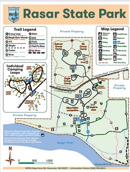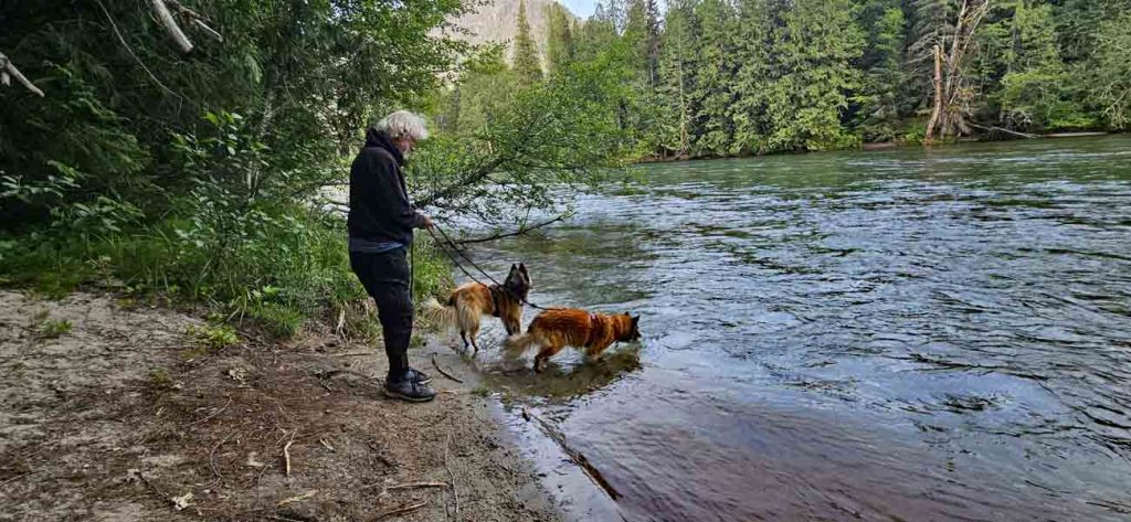 Auch hier bekamen wir einen schönen Platz mit Blick auf und gutem Zugang zum Skagit River, der aber eine zu starke Strömung hatte, so dass die Hunde nur mit den Pfoten reindurften.