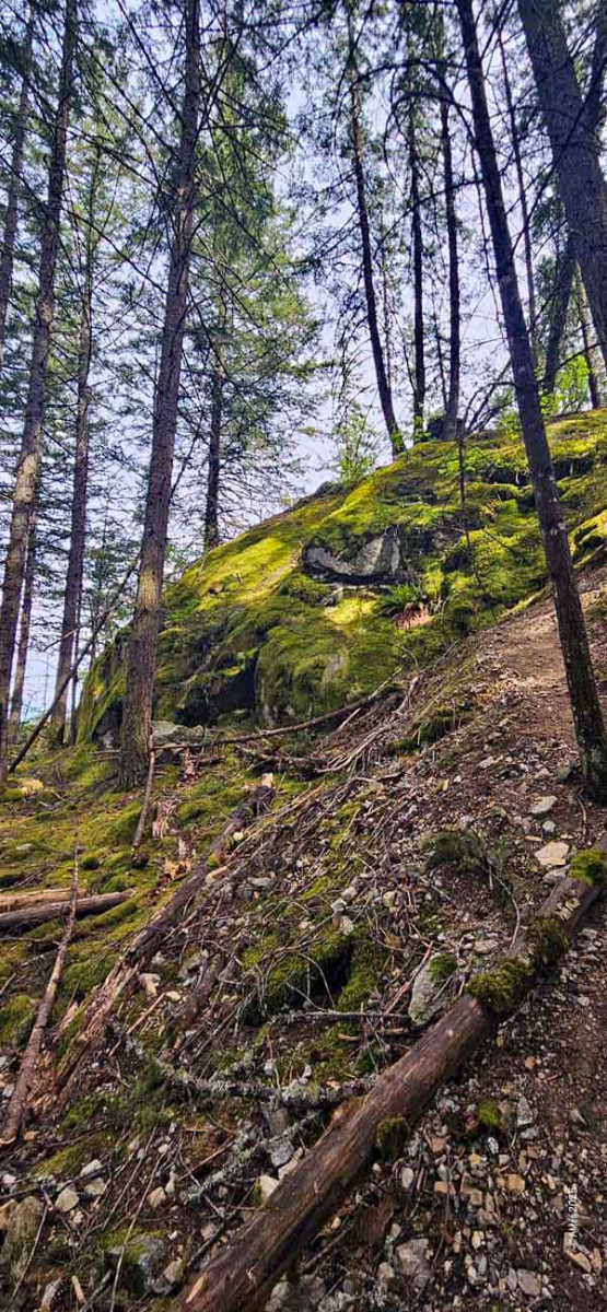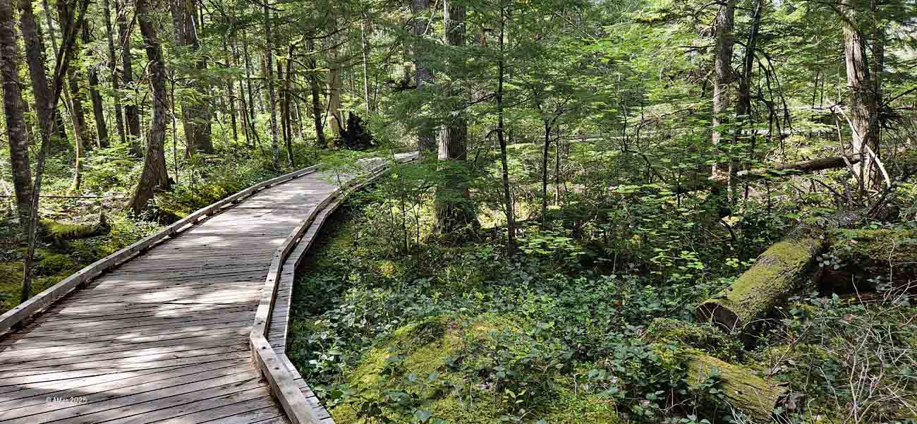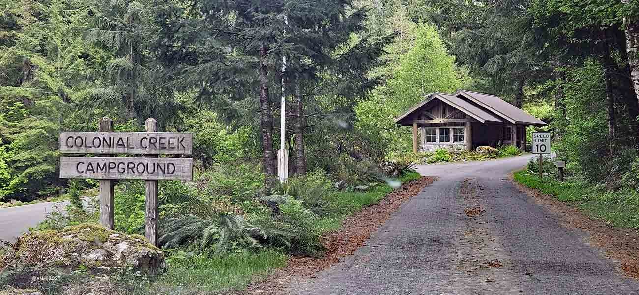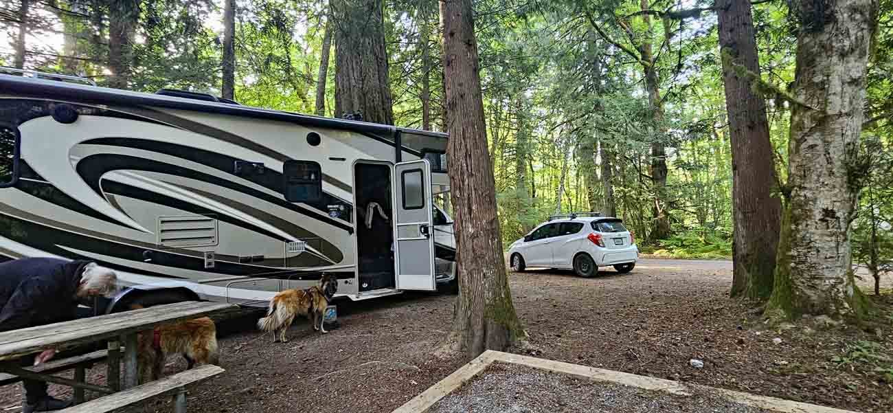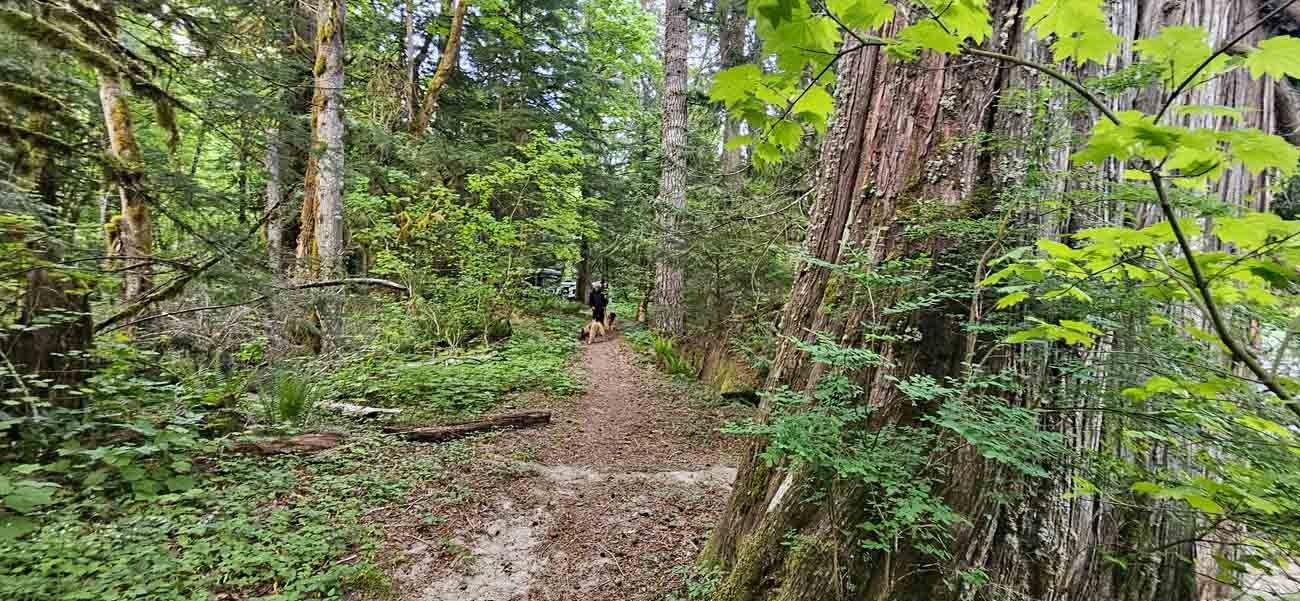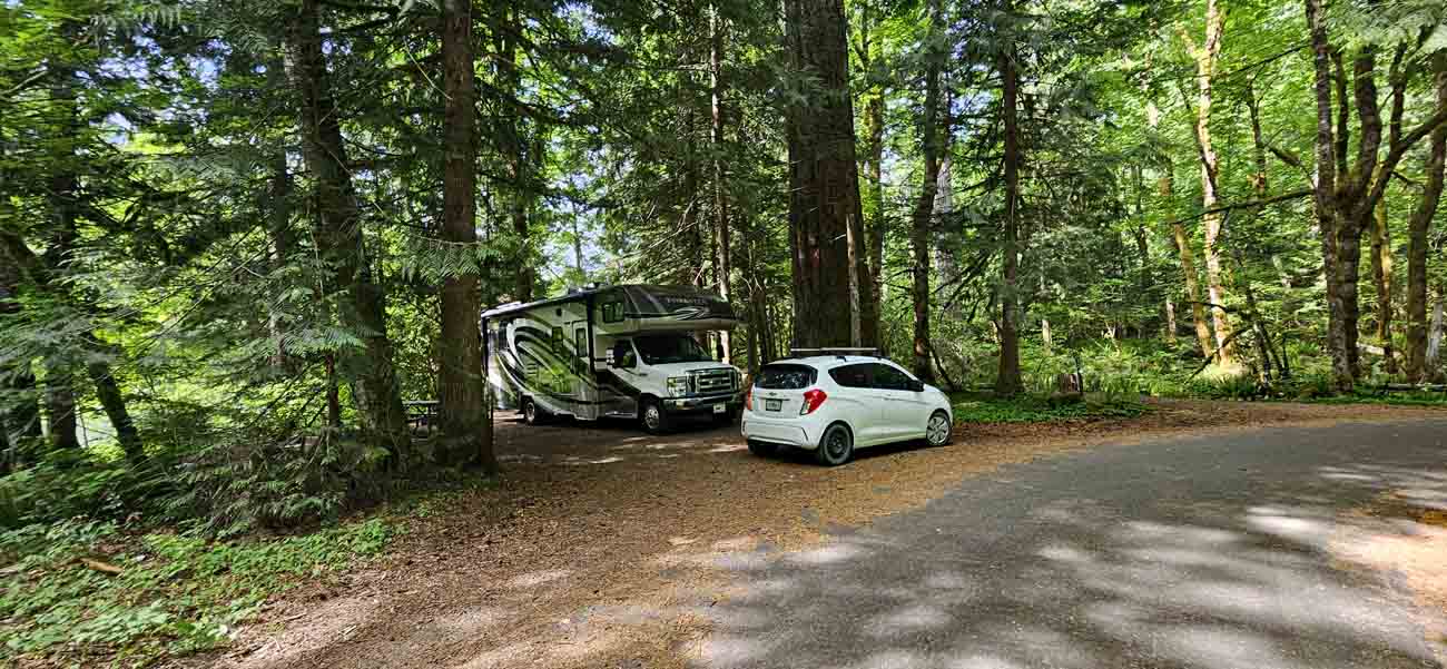 Der Platz ist sehr einfach, die 19 Stellplätze verteilen sich unter hohen Zedern, Hemlocktannen und Douglasien.