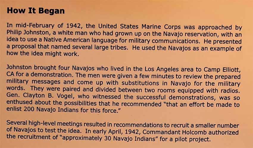 Am Beginn von WWII schlug ein bei den Navajos aufgewachsener Missionarssohn dem Marine Corps den Einsatz der Navajo Sprache vor, nach einem positiv verlaufenden Test wurden 29 Navajo rekrutiert.