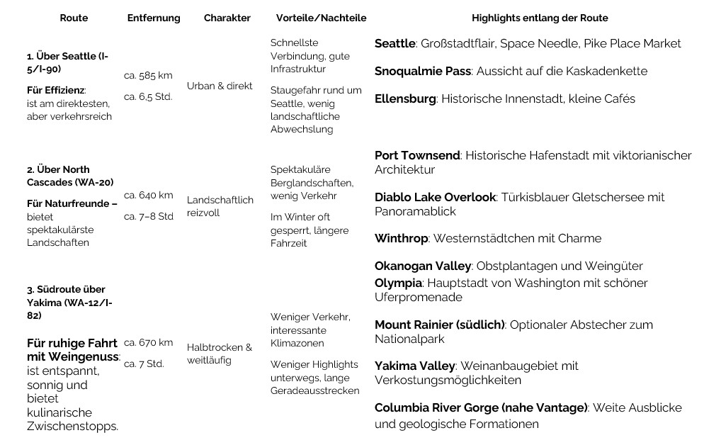 - US-101 → WA-12 → I-82 → I-90 (südlich über Yakima)