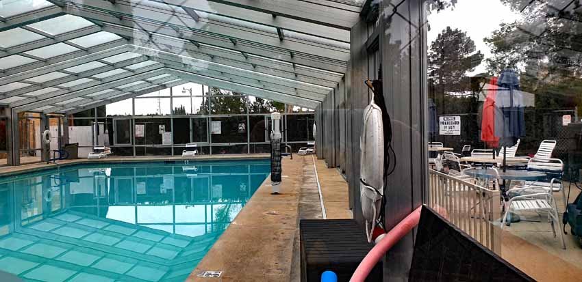 Eigentlich bietet der Platz alles, was sich der Urlauber wünscht, ein großes Schwimmbad mit variablem Dach, einen Hottub, Gesellschafträume, Billiard, und gutes WIFI, einen kleinen Dogpark – aber natürlich war das meiste geschlossen.