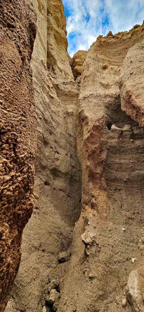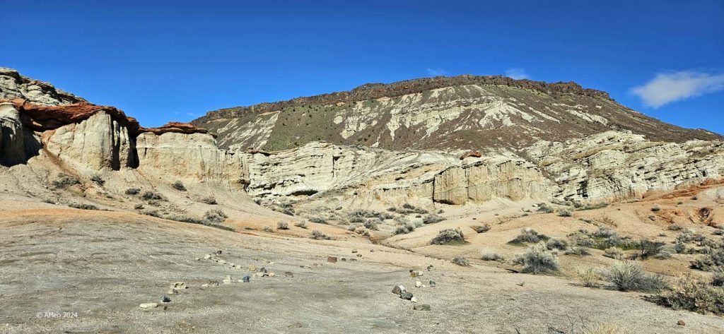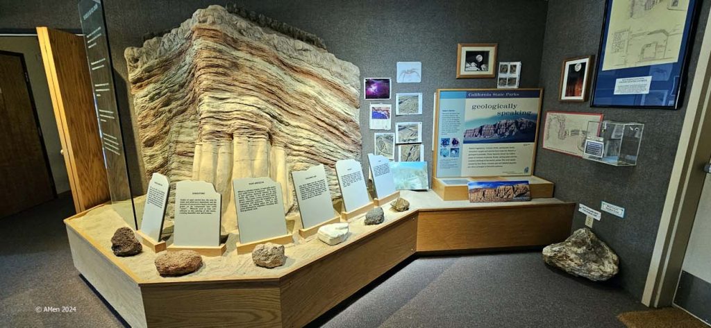 Interessant wie alt manche sind: Joshua Tree ca. 200 Jahre, Creosot-Kolonie ca. 1500 Jahre. Die Entstehung der vielfältigen Strukturen an den Wänden des Canyons wird erläutert: hartes Deckgestein vulkanischen Ursprungs hat darunter liegende weiche Schichten gerade so geschützt, dass langsame Erosion der weichen Schichten durch Wasser und Wind die vielgestaltigen Strukturen erzeugen konnte.  Deutlich erkennbar die ca. 40 Grad Kippung aller Schichten, entstanden als eine große Faltung das gesamte Gebiet gehoben und gekippt hat. Für das interessante Aussehen ist teilweise die Farbe verantwortlich, durch verschiedene Konzentrationen von Eisenoxid gibt es ein Spektrum von Farbgebungen.