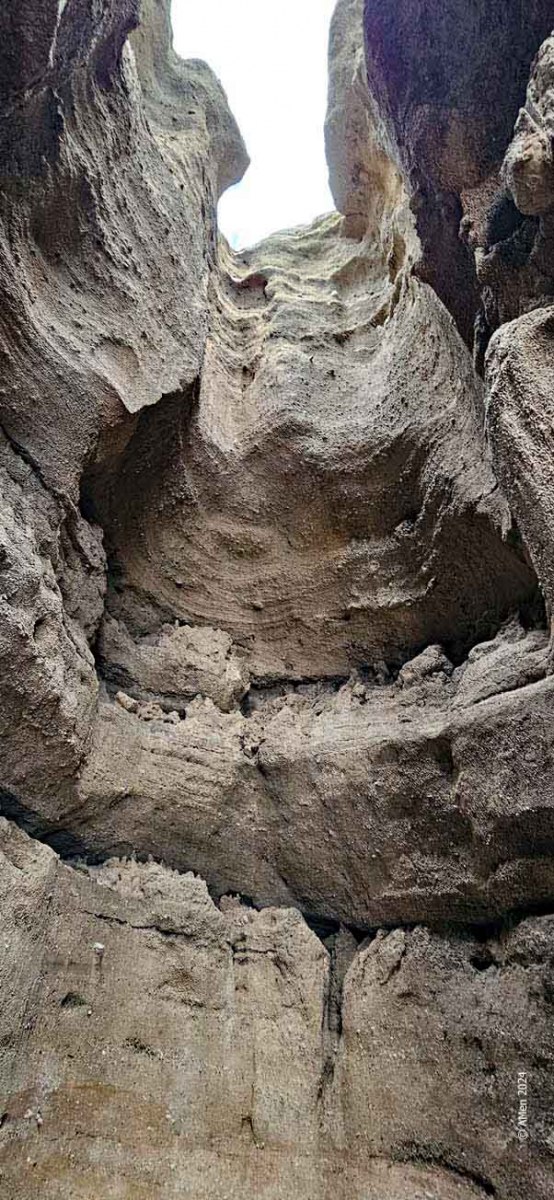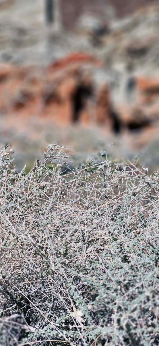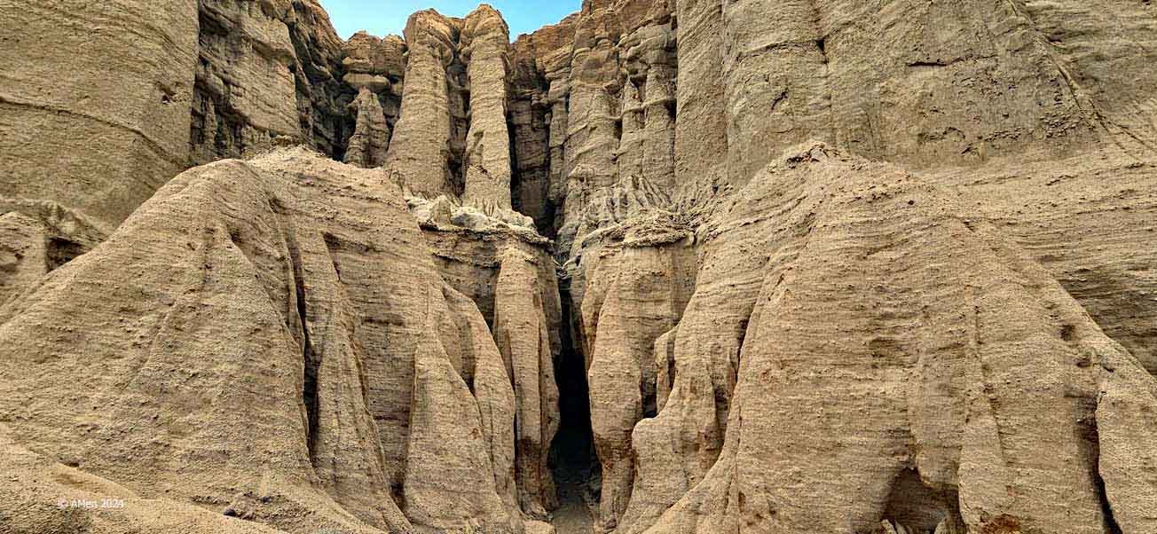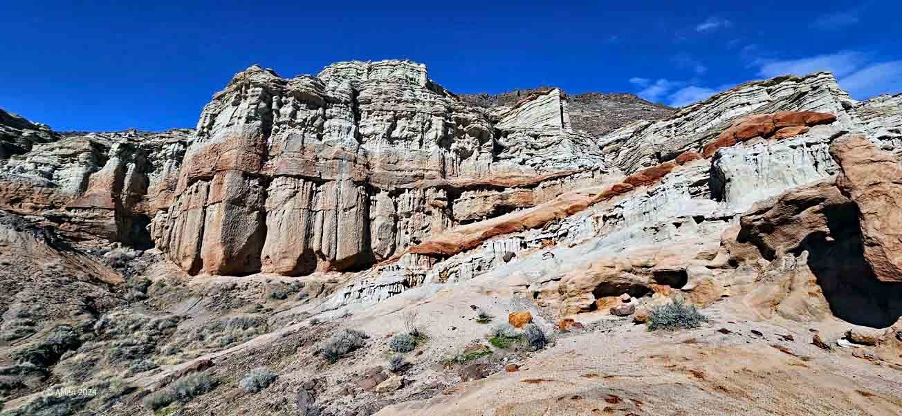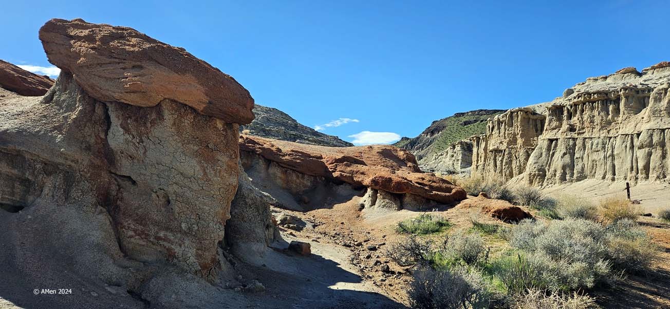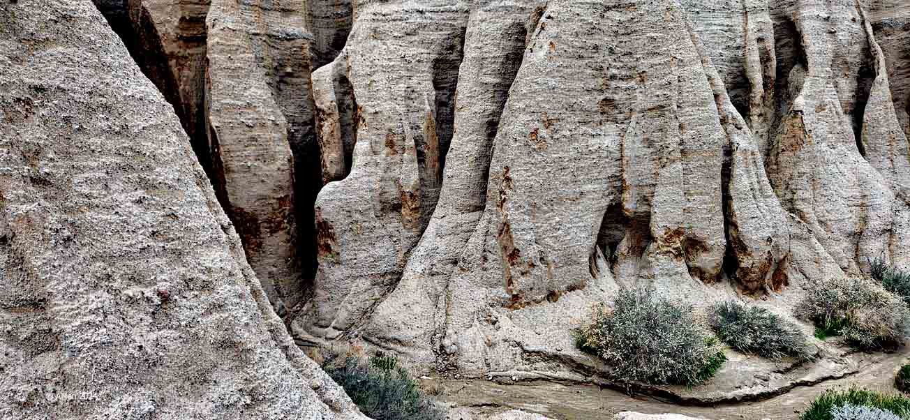 Interessant wie alt manche sind: Joshua Tree ca. 200 Jahre, Creosot-Kolonie ca. 1500 Jahre. Die Entstehung der vielfältigen Strukturen an den Wänden des Canyons wird erläutert: hartes Deckgestein vulkanischen Ursprungs hat darunter liegende weiche Schichten gerade so geschützt, dass langsame Erosion der weichen Schichten durch Wasser und Wind die vielgestaltigen Strukturen erzeugen konnte.  Deutlich erkennbar die ca. 40 Grad Kippung aller Schichten, entstanden als eine große Faltung das gesamte Gebiet gehoben und gekippt hat. Für das interessante Aussehen ist teilweise die Farbe verantwortlich, durch verschiedene Konzentrationen von Eisenoxid gibt es ein Spektrum von Farbgebungen.