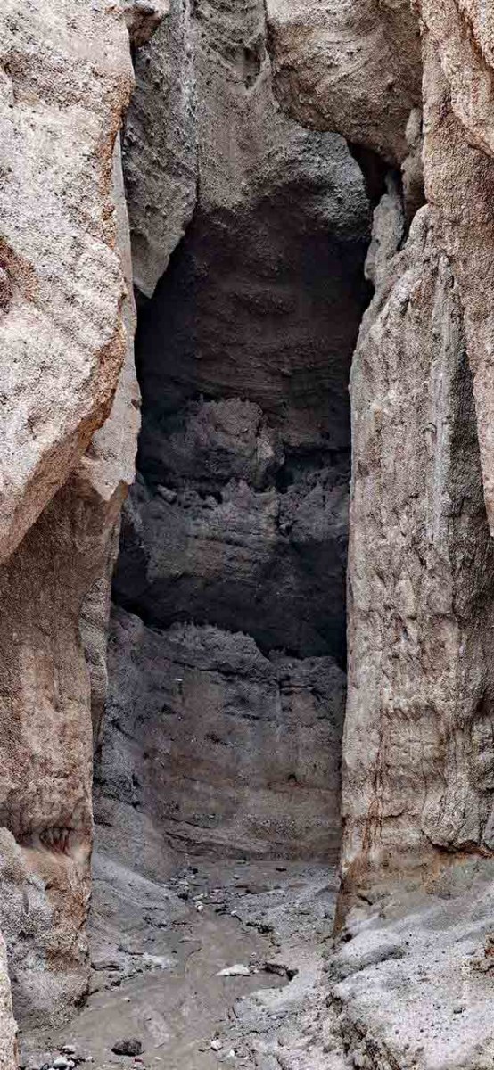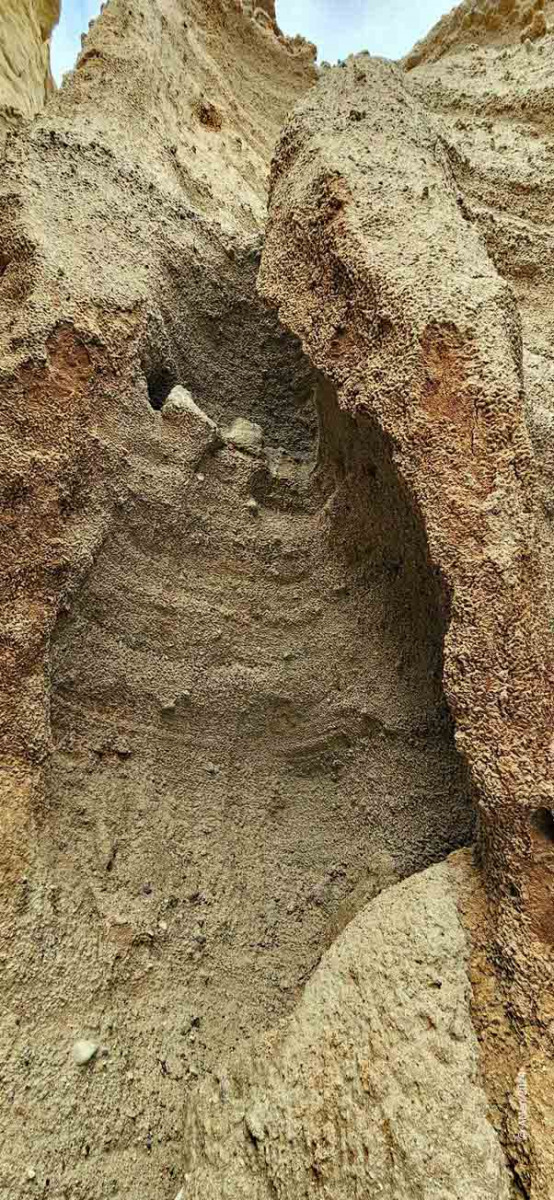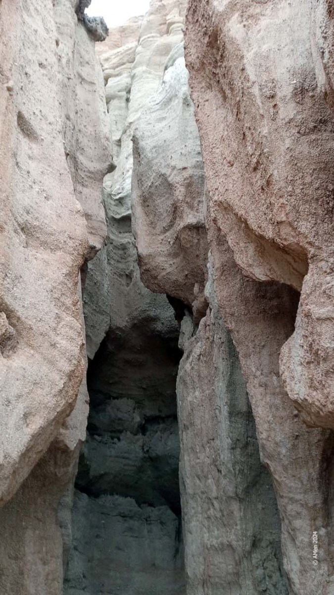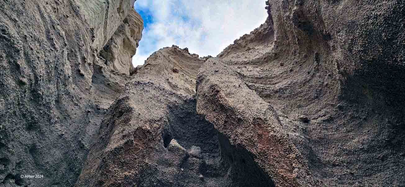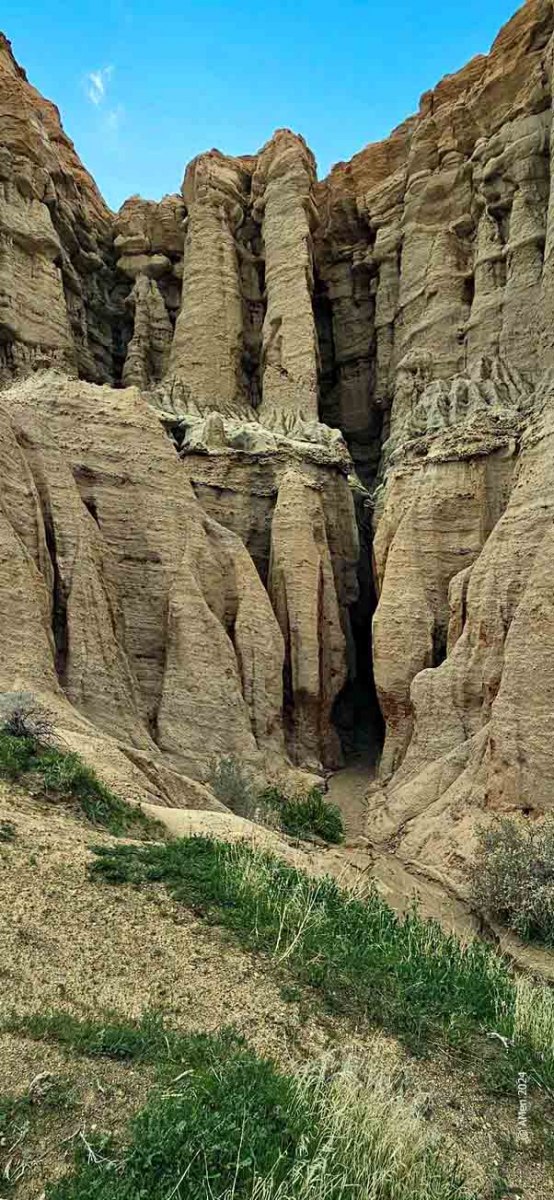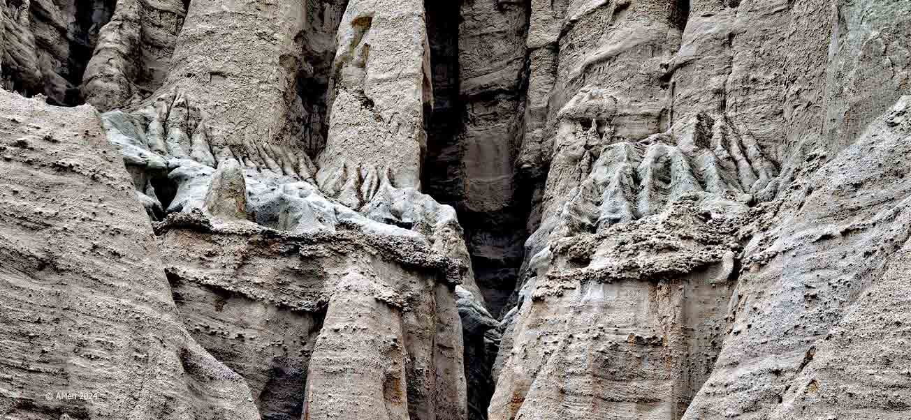 Interessant wie alt manche sind: Joshua Tree ca. 200 Jahre, Creosot-Kolonie ca. 1500 Jahre. Die Entstehung der vielfältigen Strukturen an den Wänden des Canyons wird erläutert: hartes Deckgestein vulkanischen Ursprungs hat darunter liegende weiche Schichten gerade so geschützt, dass langsame Erosion der weichen Schichten durch Wasser und Wind die vielgestaltigen Strukturen erzeugen konnte.  Deutlich erkennbar die ca. 40 Grad Kippung aller Schichten, entstanden als eine große Faltung das gesamte Gebiet gehoben und gekippt hat. Für das interessante Aussehen ist teilweise die Farbe verantwortlich, durch verschiedene Konzentrationen von Eisenoxid gibt es ein Spektrum von Farbgebungen.