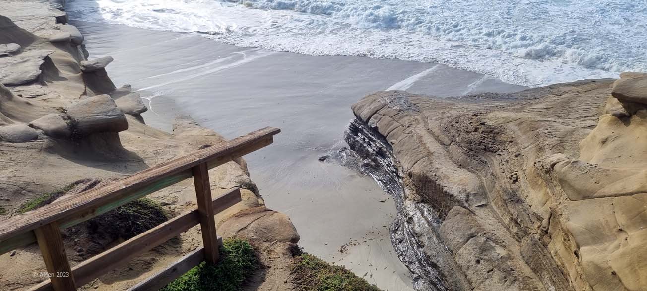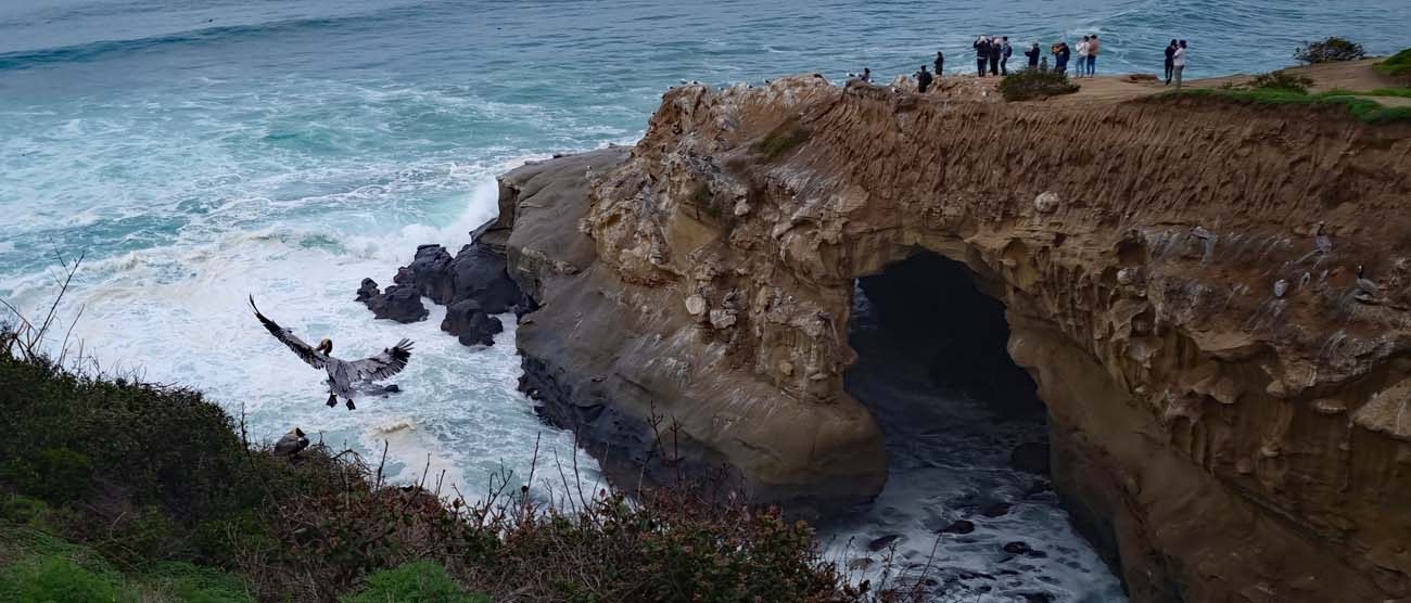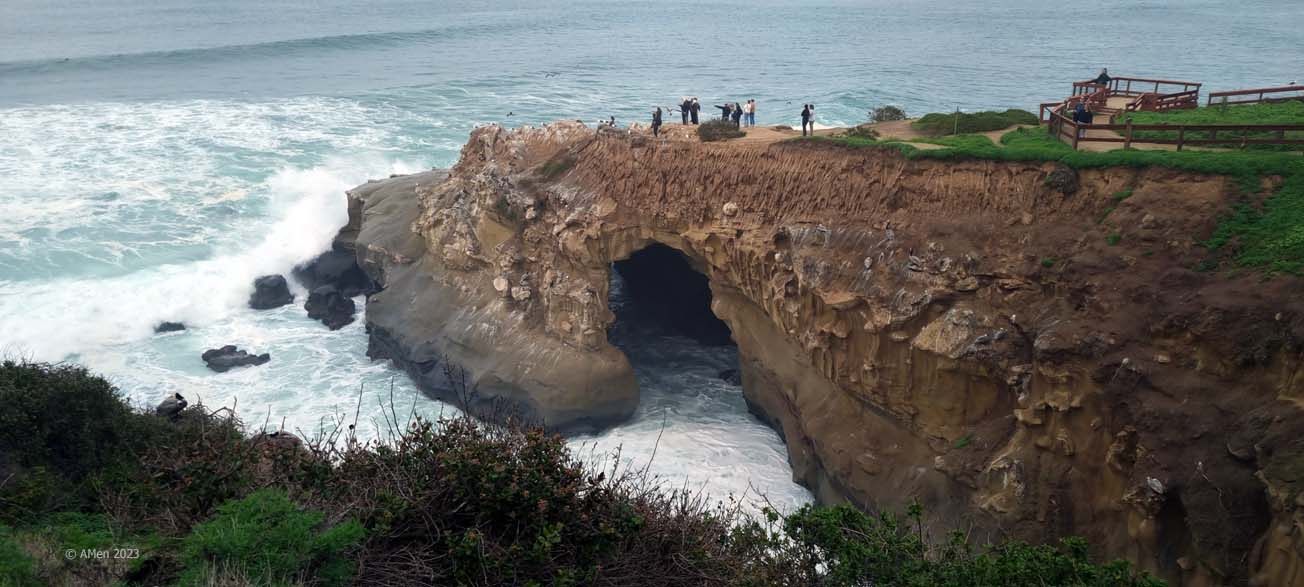 Der Eingang ist im Historischen Cave Store, zunächst einmal steigt man 144 enge Stufen hinunter zu einem Aussichtspunkt innerhalb der Meereshöhle. Von dort hat man einen fantastischen Blick durch die Sunny Jims Meereshöhle auf die La Jolla Cove.
