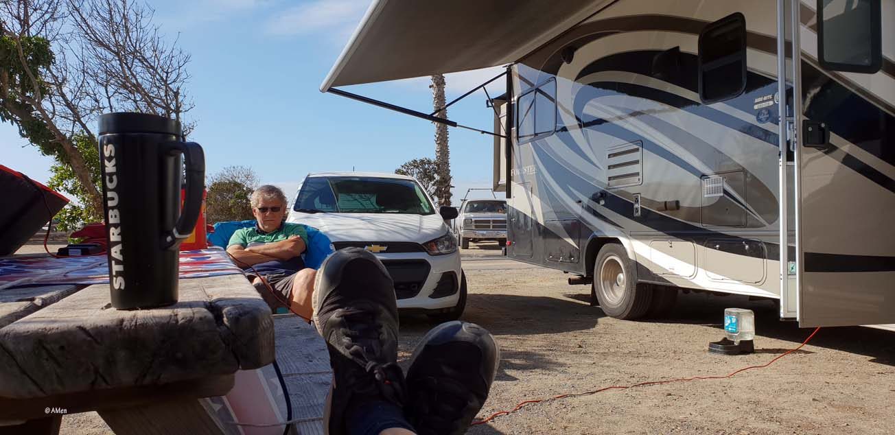 Der Platz ist jetzt nicht so der Renner; die Aussage eines Nachbarn, es sei seit Jahren sein absoluter Lieblingsplatz, konnten wir nicht so ganz nachvollziehen. Für Surfer mag er auf jeden Fall geeignet sein, sie müssen sich nur ihr Brett unter den Arm klemmen und die Treppe zum Sandstrand runter.