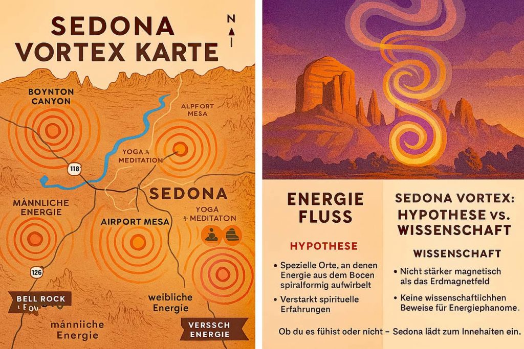 Zu den bekannten Vortex-Standorten gehören Bell Rock, Cathedral Rock, Airport Mesa und Boynton Canyon. An diesen Orten kann man wandern, meditieren, Yoga praktizieren und Energiearbeit durchführen. Viele Menschen berichten von Gefühlen von Frieden, Inspiration und erhöhtem spirituellen Bewusstsein. Die Sedona Vortexe sind jedoch wissenschaftlich nicht nachgewiesen und Ansichten über ihre Existenz variieren. Einige betrachten sie als subjektive Erfahrung oder genießen einfach die natürliche Schönheit von Sedona.