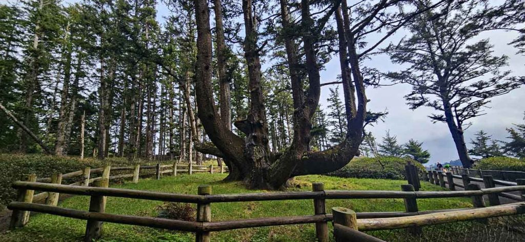 Überquert man den Parkplatzes kommt man zum Ocotpus Tree, eine Sitka Fichte ungewöhnlicher Form, einem geschützten Naturdenkmal:. Diese hat keinen zentralen Stamm, sondern mehrere massive Äste verzweigen sich direkt am Boden, wodurch er wie ein Oktopus oder auch ein Kerzenleuchter aussieht. Das Alter wird auff etwas 250 bis 300 Jahre geschätz.
