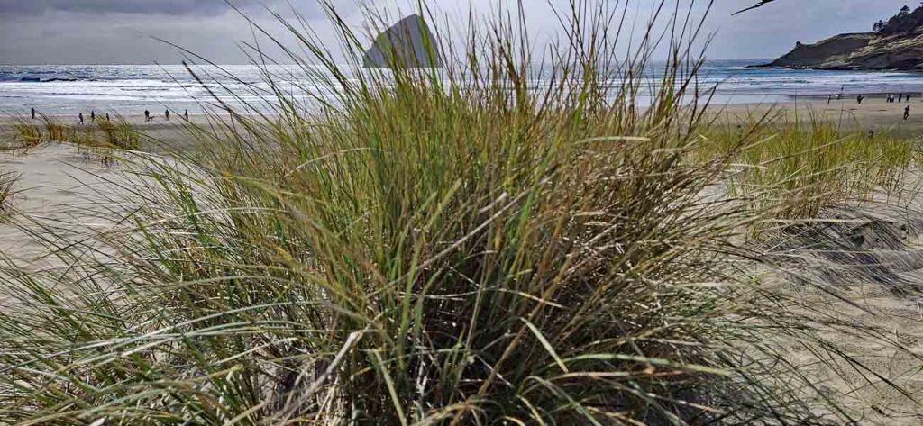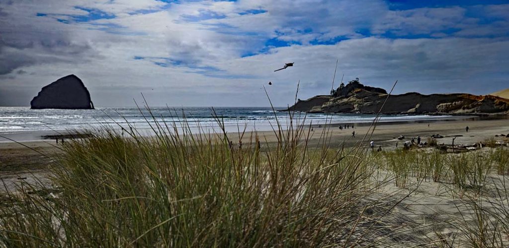Am Strand von Pacific City in Cape Kiwanda fällt der Blick auf einen riesigen Haystack Rock – einen „Heuhaufen“ – ein auffälliger 100 Meter hoher Felsblock aus Basalt, der etwa eine Meile vor der Küste von Pacific City im Meer steht.