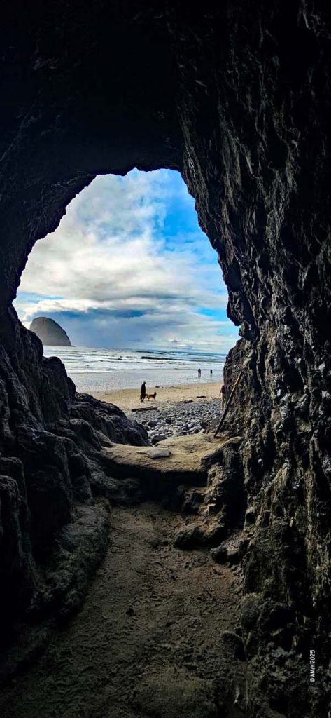 Hinter dem Durchgang öffnet sich ein ruhiger, geschützter Strand mit direktem Blick auf die Three Arch Rocks