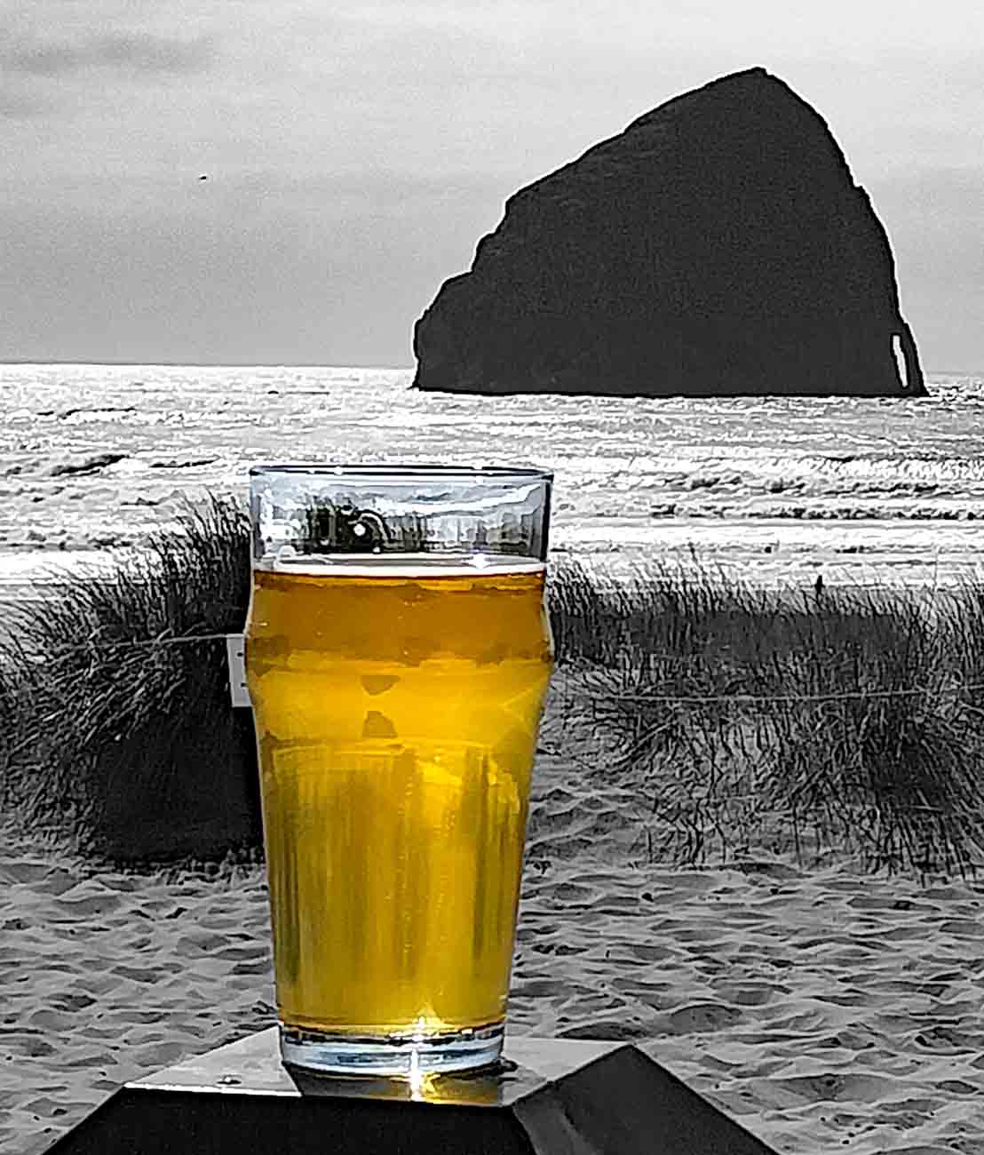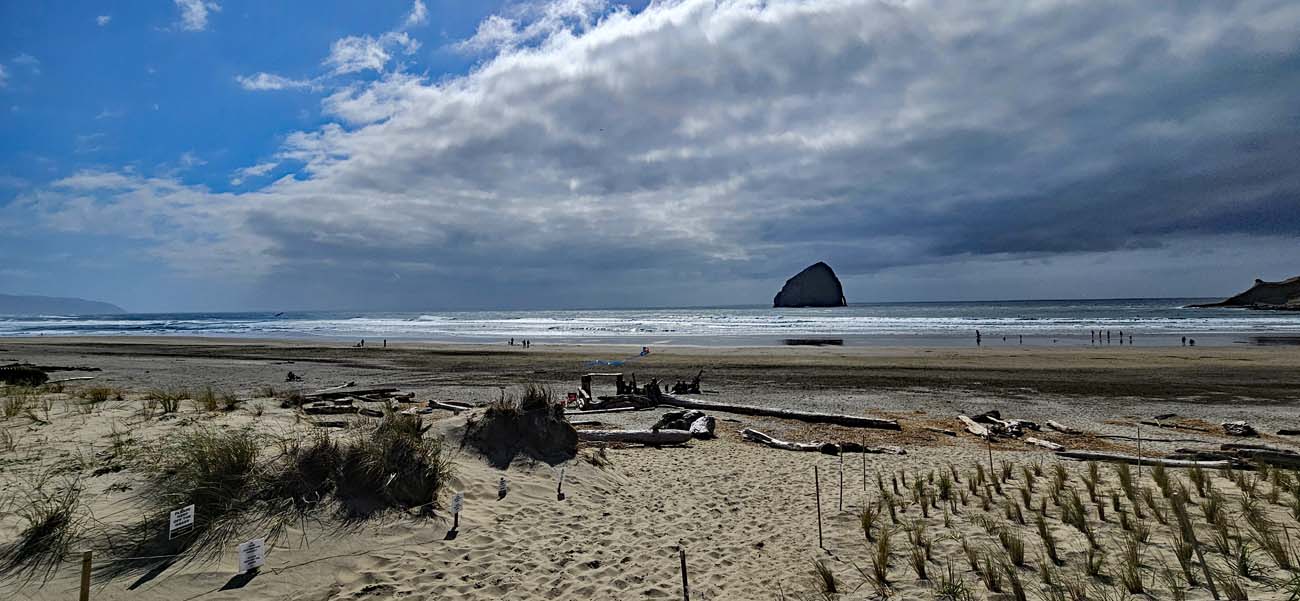 Am Strand von Pacific City in Cape Kiwanda fällt der Blick auf einen riesigen Haystack Rock – einen „Heuhaufen“ – ein auffälliger 100 Meter hoher Felsblock aus Basalt, der etwa eine Meile vor der Küste von Pacific City im Meer steht.