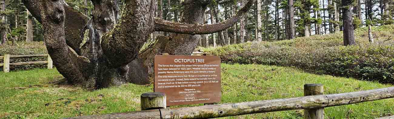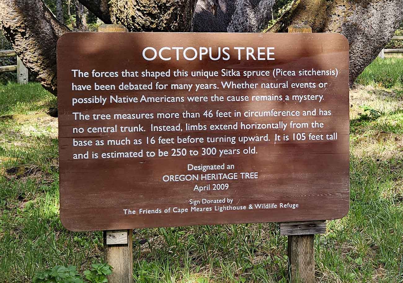 Überquert man den Parkplatzes kommt man zum Ocotpus Tree, eine Sitka Fichte ungewöhnlicher Form, einem geschützten Naturdenkmal:. Diese hat keinen zentralen Stamm, sondern mehrere massive Äste verzweigen sich direkt am Boden, wodurch er wie ein Oktopus oder auch ein Kerzenleuchter aussieht. Das Alter wird auff etwas 250 bis 300 Jahre geschätz.