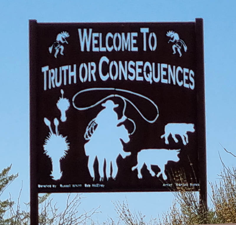 Ursprünglich hieß der Ort Hot Springs, wie vermutlich hunderte andere amerikanische Städte. 1950 wurde er umbenannt nach einer Rundfunksendung namens Truth or Consequences (Wahrheit oder Pflicht), was auch ein beliebtes Gesellschaftsspiel, vorwiegend für Jugendliche, ist. Edwards, der Moderator, hatte versprochen die Sendung in der Stadt zu produzieren, die den Namen der Show annimmt.